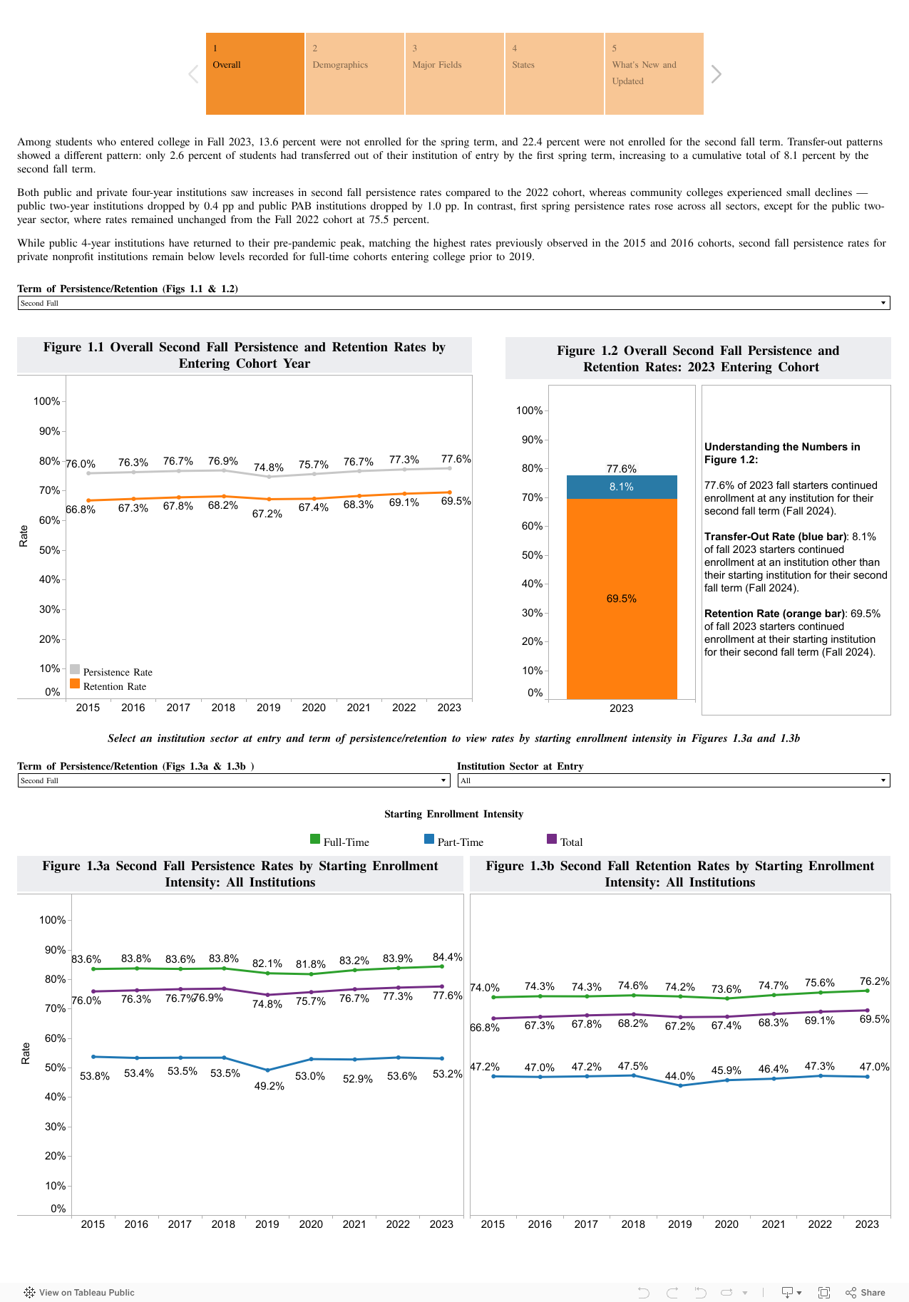 - The national second fall persistence rate for the 2023 cohort is 77.6 percent, and the second fall retention rate is 69.5 percent. These rates represent increases of 0.3 percentage points (pp) and 0.4 pp, respectively, from the 2022 cohort.