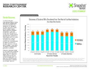 In each year studied, about 60 percent of all two-to-four transfer students graduated with a bachelor’s or higher degree within four years of transferring. In addition, 12 percent of all transfer students had not yet graduated, but were still enrolled at a four-year institution in the last year of analysis. In total, about 72 percent of students either graduated or persisted.